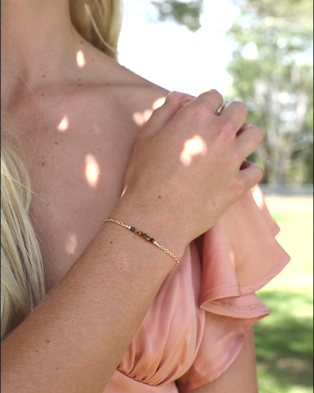 Make every day special in our tiny tiger's eye gemstone bead bar bracelet. This bracelet is a dainty, feminine design. The semi-precious gemstone beads used in this bracelet are made from natural, genuine gemstones that have been faceted cut so they sparkle in the light, making it the ideal bracelet for evening wear, weddings and special occasions.